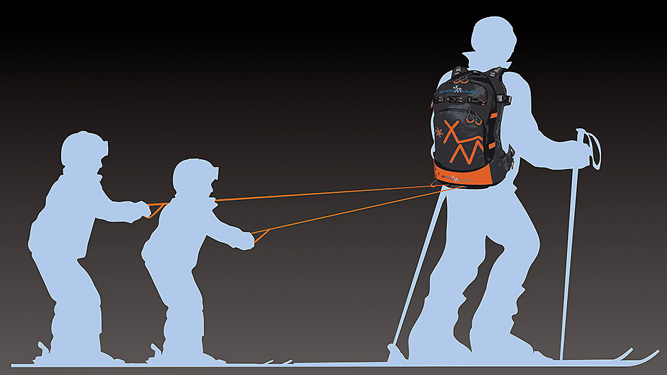 Dodatkowo do plecaka można przy pomocy łatwo dostępnych zewnętrznych karabińczyków przymocować dwa kaski, rękawiczki i gogle. Drugie udogodnienie dotyczy już samej jazdy na nartach, a czego dokładnie? Otóż plecak wyposażony jest w dwie wysuwane ze specjalnej kieszeni taśmy z uchwytami – na płaskich odcinkach trasy dzieci mogą być więc ciągnięte przez rodzica. Wytrzymałość taśm sięga 45 kg. Jak widać to, że plecak nazwano „Snowmule” nie jest, jak się okazuje jedynie przypadkiem …